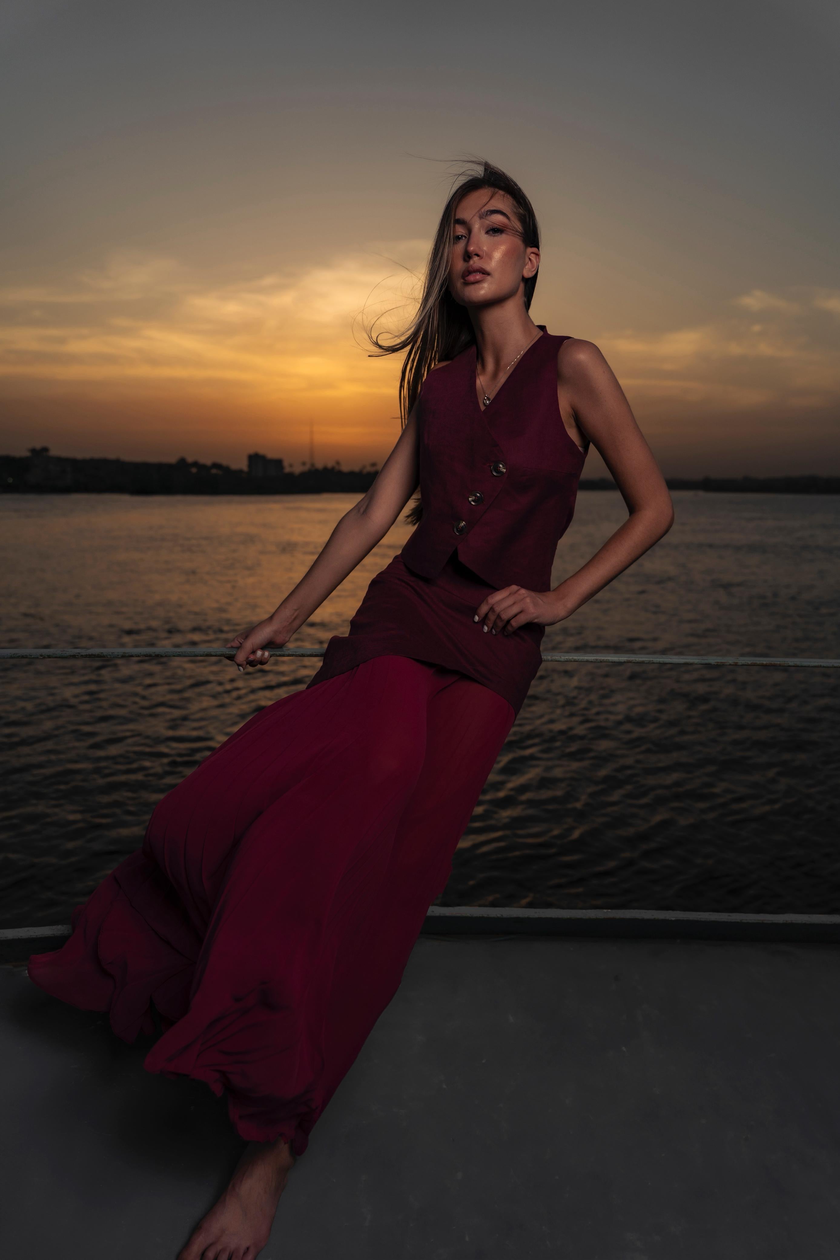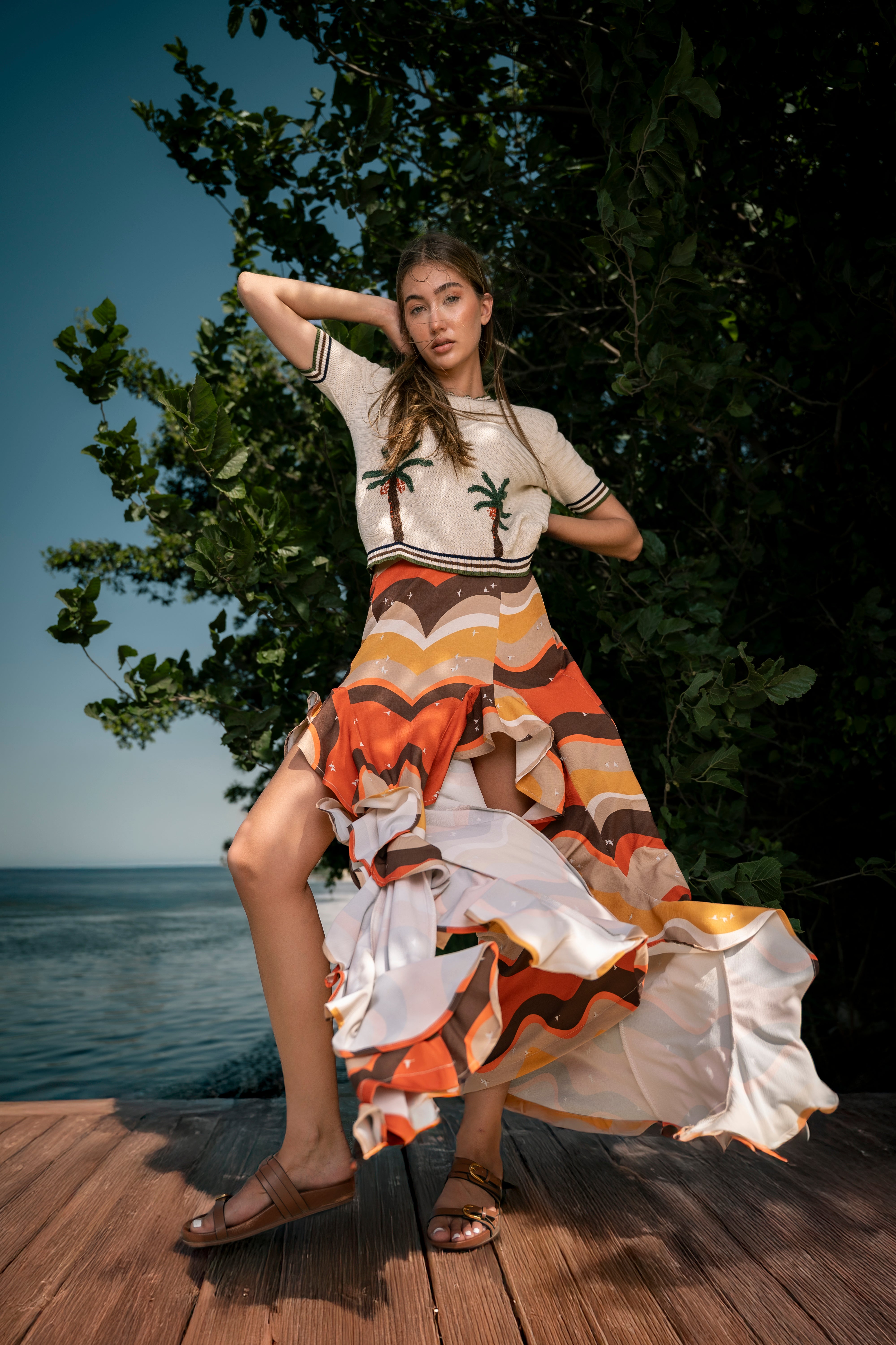 A fashion-forward combination featuring a structured half-sleeve button-up with bold stripes. Paired perfectly with a distinctive skirt showcasing an artistic ripple cutout hem and delicate fig embroidery detail.