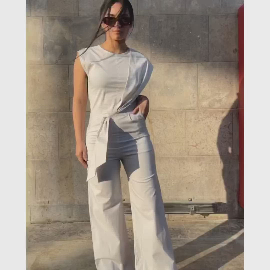 Poplin cotton jumpsuit in light grey color featuring front drape scarf knotted at waist.